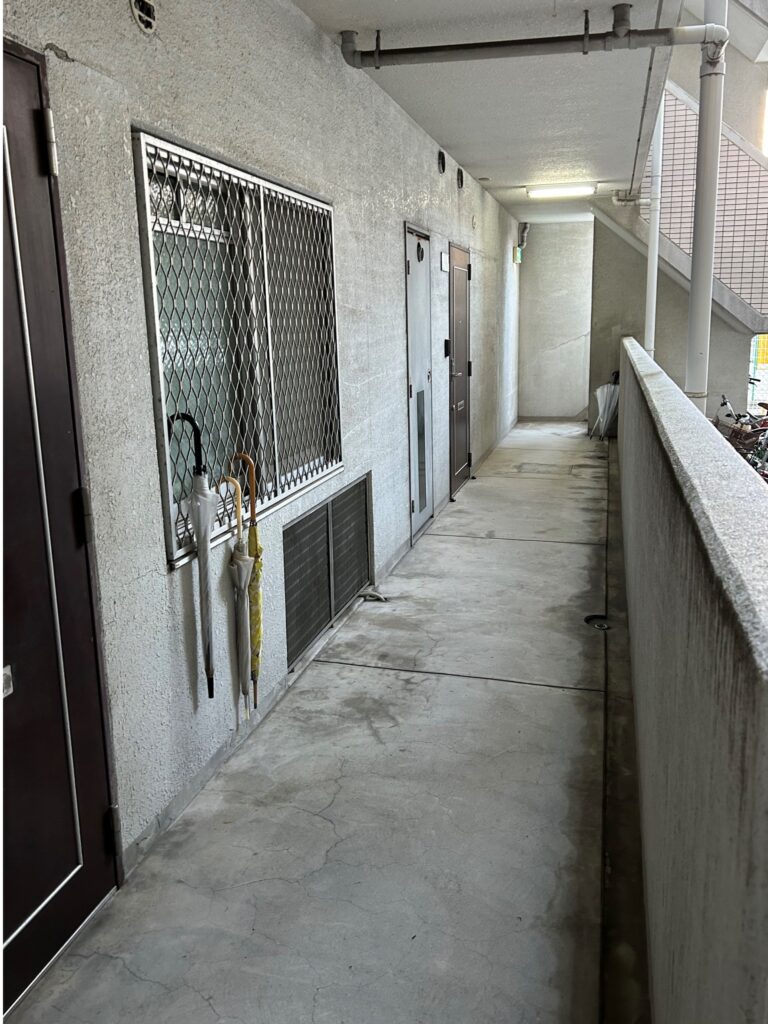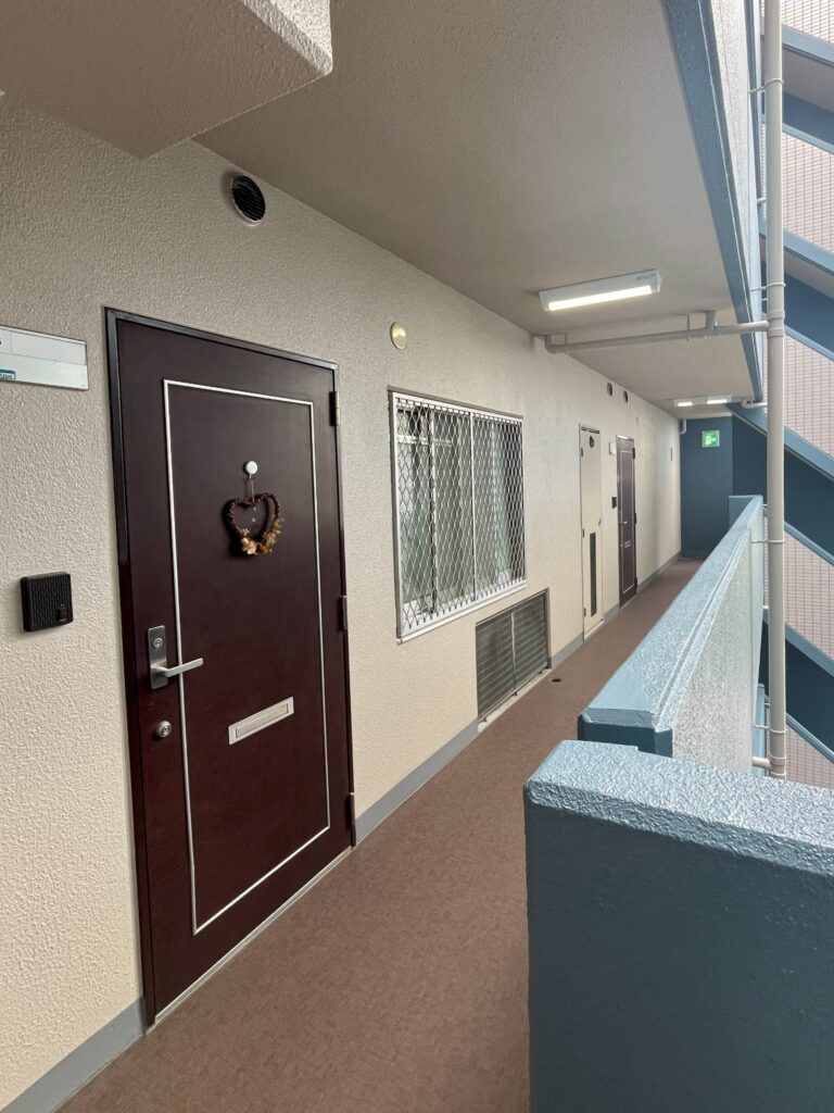 こちらの写真は、本社から徒歩15秒の「レジデンス野田阪神」と徒歩5分の「シティレジデンス福島X」という物件です。外壁を塗装したのですが、古びた外観から空と同じくらい澄み切った水色になりました!さらに共用廊下も無機質なコンクリートから長尺シートに変更することにより見違えるようになっています。色が変わるだけでも、なんだか建物が生まれ変わったような気分になります。