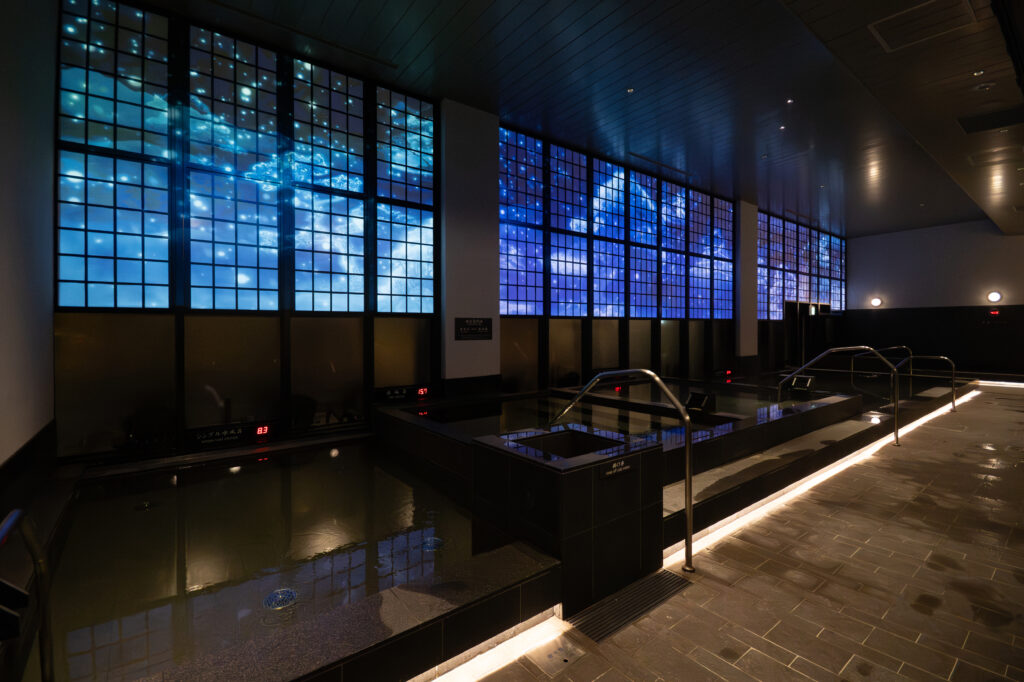 茶の湯(さのゆ)エリアは日本の和をモダンテイストで表現した空間になっており、季節に合わせた映像がプロジェクションマッピングで障子に投影され、ゆったりとお風呂に入りながら日本の四季を感じることができます。
